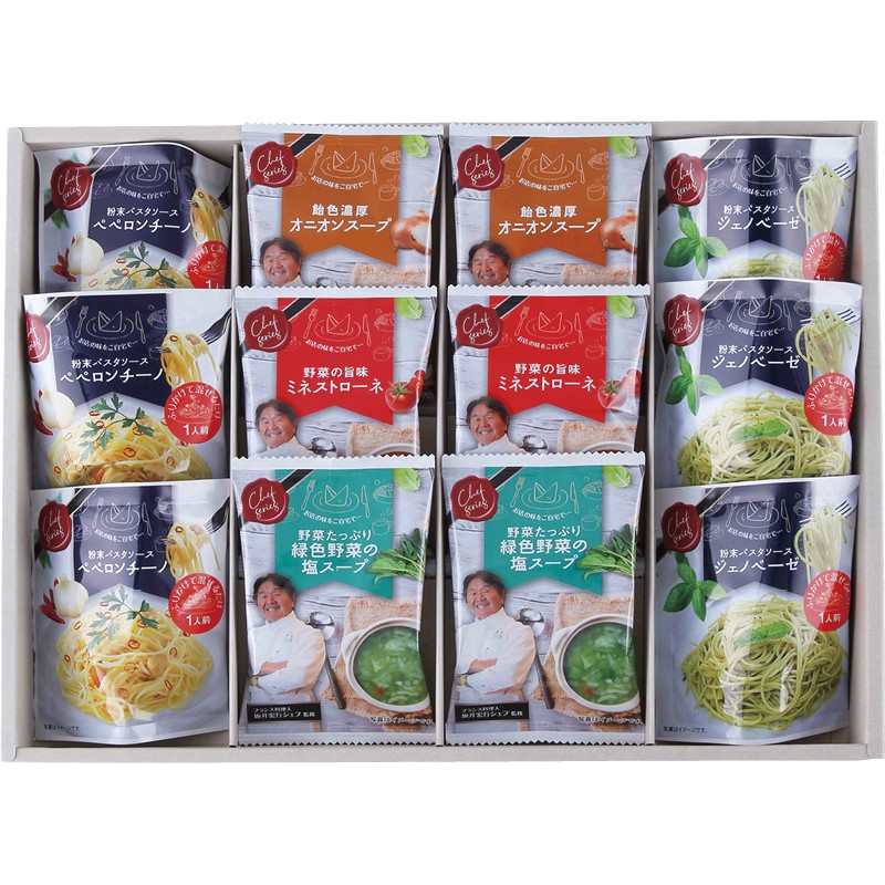 粉末パスタソース(ジェノベーゼ・ペペロンチーノ)×各3、オニオンスープ・ミネストローネ・緑色野菜の塩スープ×各2