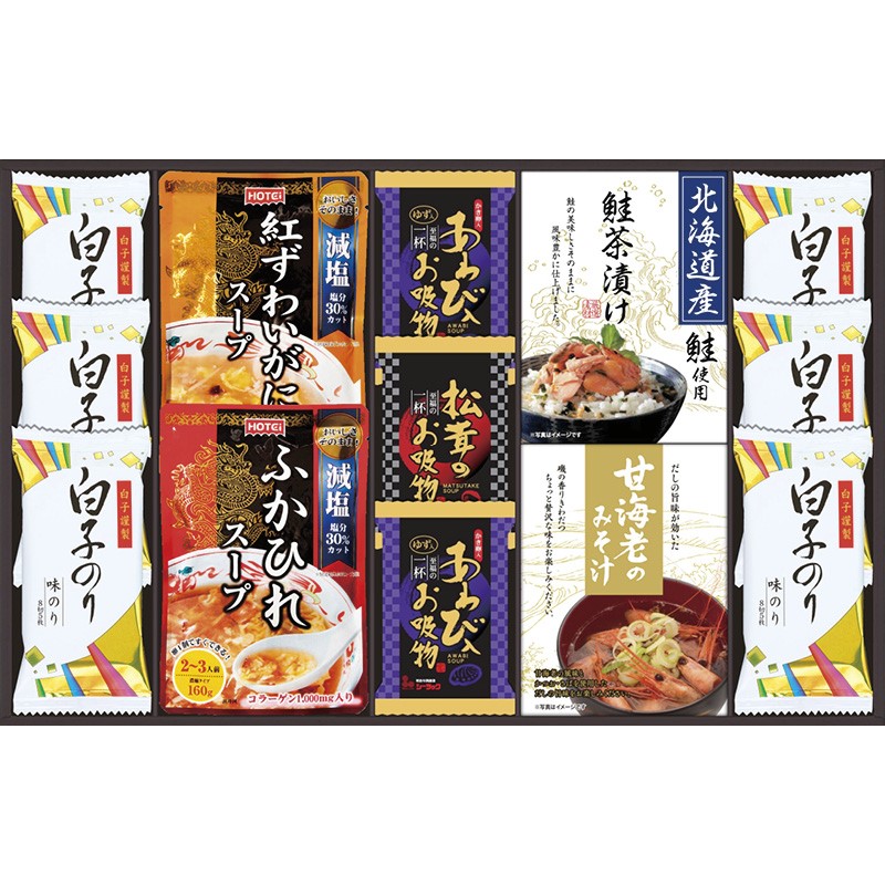 白子のり(8切5枚)×6、あわび入お吸物(4g)×2、ふかひれスープ・紅ずわいがにスープ(各160g)・甘海老のみそ汁(7.5g×3袋)・松茸のお吸物(4.2g)・北海道産鮭茶漬け(4g×3袋)×各1