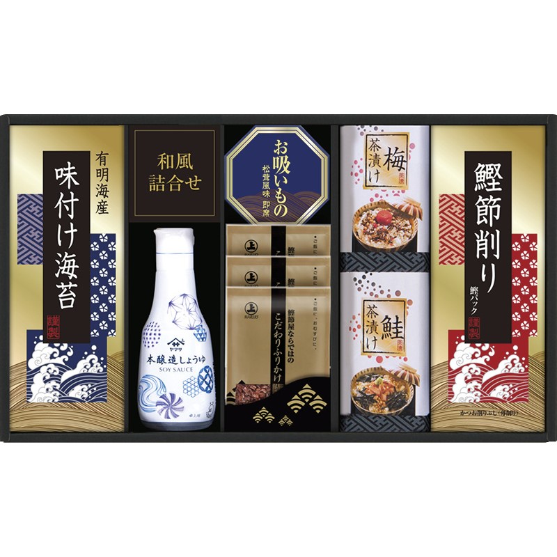 こだわりふりかけ(6g)×3、ヤマサ鮮度卓上しょうゆ(200ml)・鮭茶漬け(4.7g×2袋)・梅茶漬け(4.3g×2袋)・永谷園お吸いもの松茸風味(2.3g×2袋)・鰹節削り(2g×4袋)・有明海産味付け海苔(3切6枚)×各1