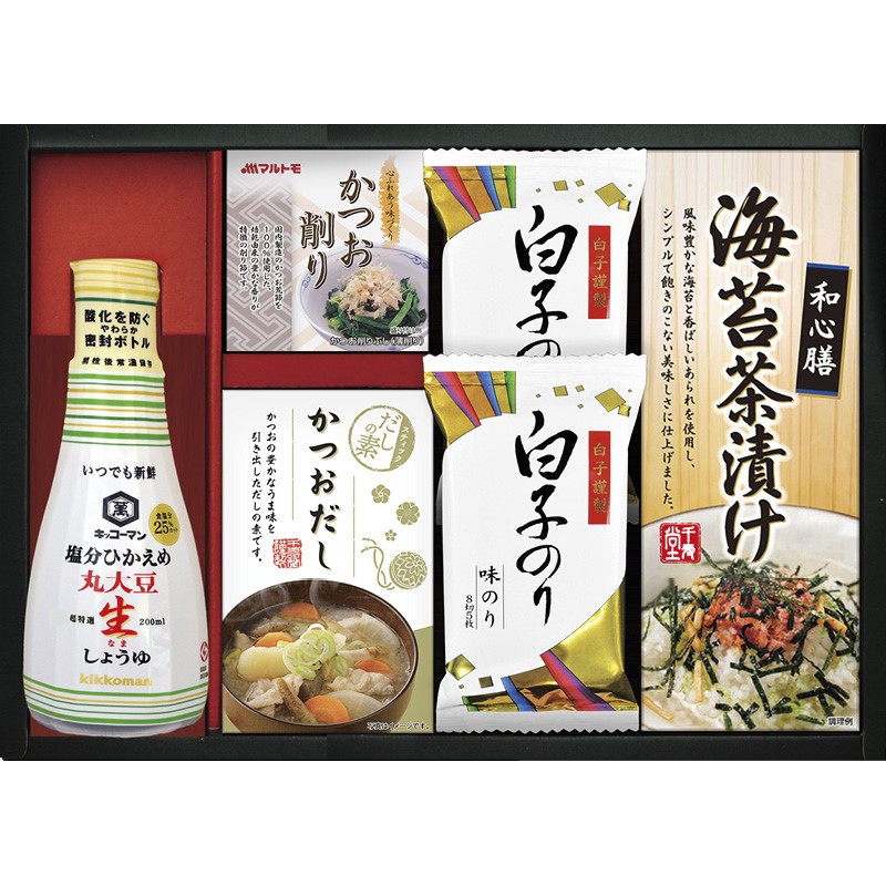 白子のり味のり(8切5枚)×2、キッコーマン塩分ひかえめ丸大豆生しょうゆ(200ml)・海苔茶漬け(6g×5)・かね七かつおだし(4g×5)・マルトモかつおパック(0.7g×3)×各1