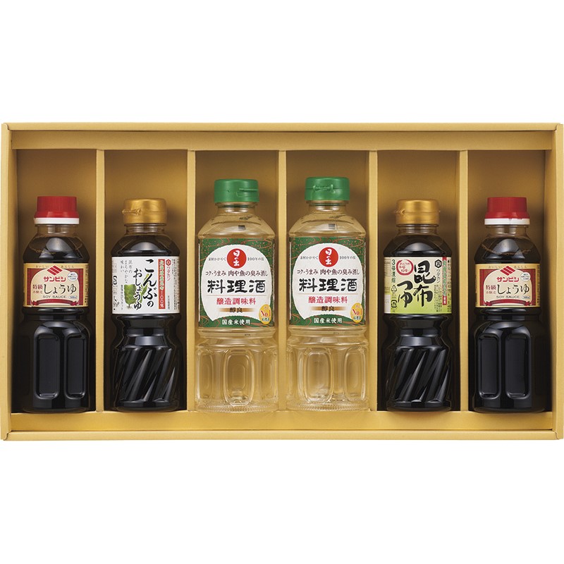 日の出料理酒(400ml)・サンビシ特級本醸造しょうゆ(300ml)×各2、ワダカン(昆布つゆ・こんぶのおしょうゆ)(各300ml)×各1