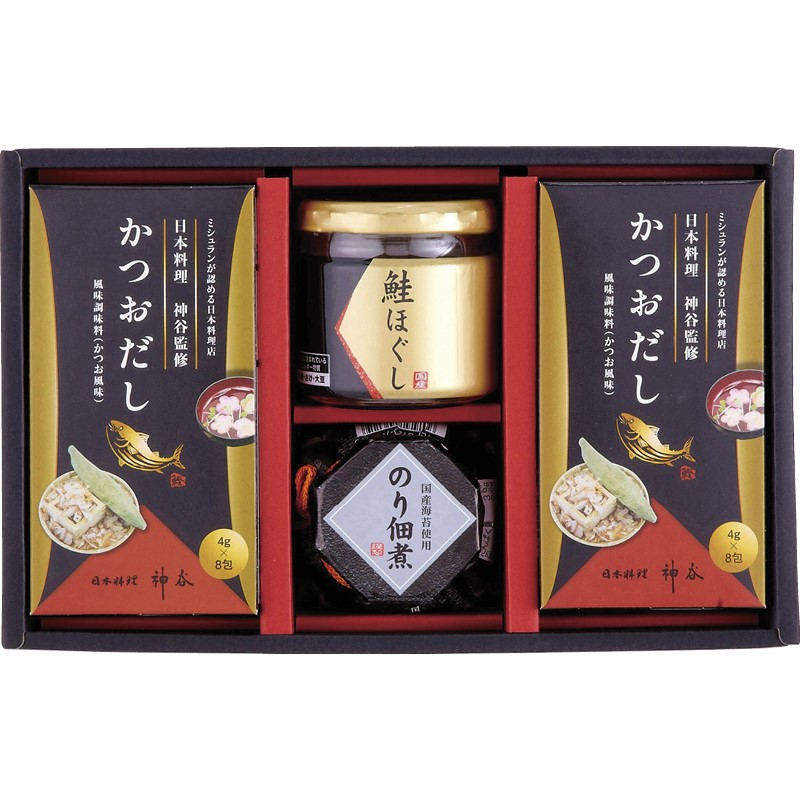 日本料理神谷監修かつおだし(4g×8袋)×2、のり佃煮(80g)・鮭ほぐし(50g)×各1