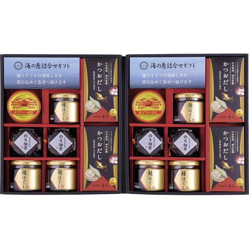 鮭ほぐし(50g)×6、のり佃煮(80g)・日本料理神谷監修かつおだし(4g×8袋)×各4、紅ずわいがにほぐし身(55g)×2
