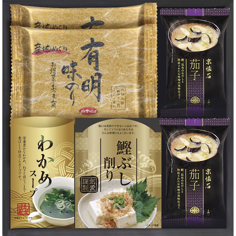 白子有明味のり(8切8枚)・マルコメ京懐石茄子のおみそ汁(11.5g)×各2、わかめスープ(5.3g×2袋)・鰹ぶし削り(2g×3袋)×各1