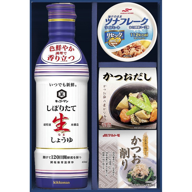 キッコーマンしぼりたて生しょうゆ(450ml)・マルハニチロ油そのままライトツナリセッタ(70g)・シーラックかつおだし(4g×3袋)・マルトモかつおパック(0.7g)×各1