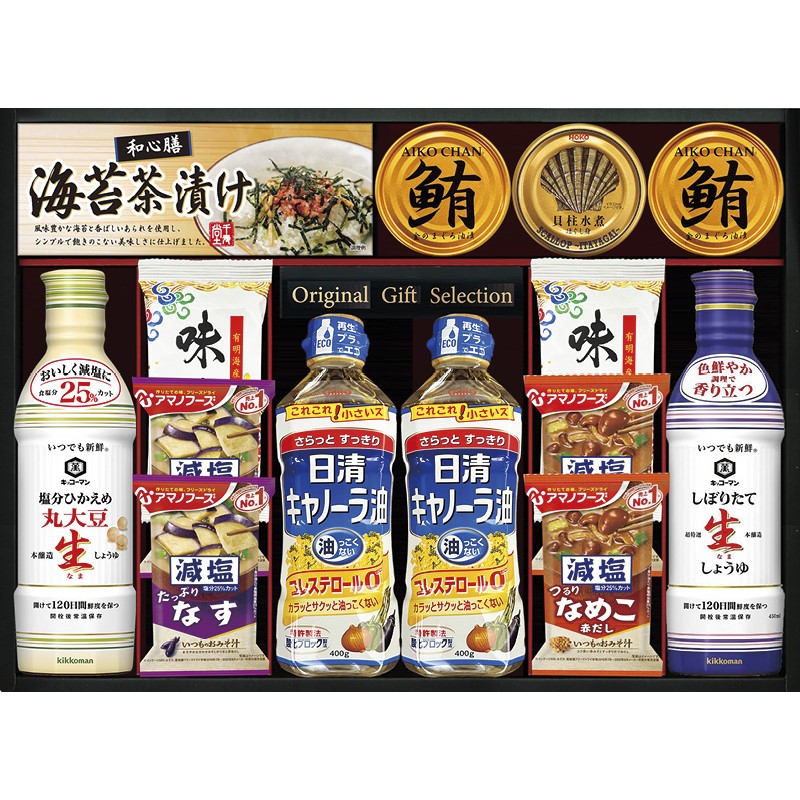 日清キャノーラ油(400g)・まぐろ油漬け(70g)・アマノフーズ減塩いつものおみそ汁なす(9g)・アマノフーズ減塩いつものおみそ汁なめこ(8g)・有明海産味のり(8切5枚)×各2、キッコーマン(塩分ひかえめ丸大豆生しょうゆ・しぼりたて生しょうゆ)(各450ml)・宝幸貝柱水煮ほぐし身(65g)・海苔茶漬け(6g×5袋)×各1