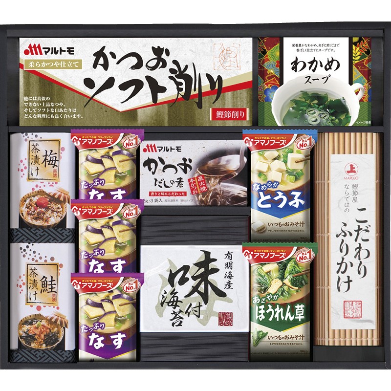 アマノなすおみそ汁(9.5g)×3、アマノとうふおみそ汁(10g)・マルトモかつおだしの素(8g×3袋)・アマノほうれん草おみそ汁(7g)・こだわりふりかけ(6g×3袋)・わかめスープ(5.3g×2袋)・鮭茶漬け(4.7g×2袋)・梅茶漬け(4.3g×2袋)・マルトモかつおソフト削り(2g×4袋)・有明海産味付海苔(8切8枚×2袋)×各1