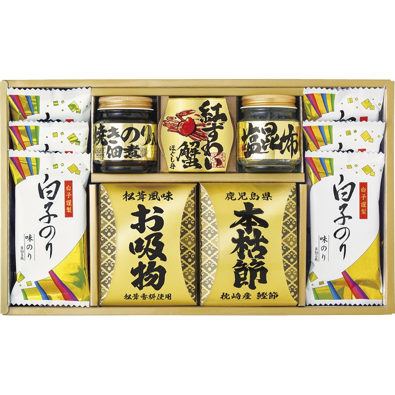白子のり味のり(8切5枚入)×6、焼きのり入佃煮(85g)・紅ずわいがにほぐし身(55g)・塩昆布(18g)・枕崎産本枯節(2.5g×2袋)・松茸風味お吸い物(2.3g×3袋)×各1