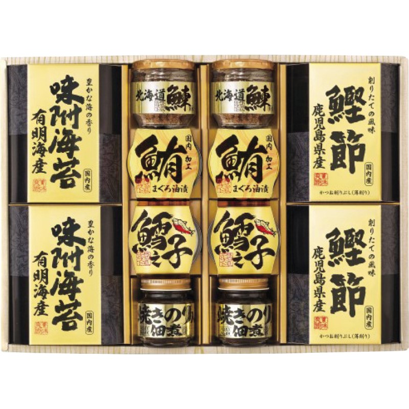 焼きのり入佃煮(85g)・まぐろ油漬け・鱈之子味付け(各70g)・北海道産鰊フレーク(50g)・鹿児島県産鰹節(2g×3)・有明海産味附海苔(8切10枚入)×各2