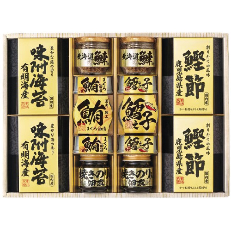 まぐろ油漬け・鱈之子味付け(固形量45g)(各70g)×各3、焼きのり入佃煮(85g)・北海道産鰊フレーク(50g)・有明海産味附海苔(8切10枚入)・鹿児島県産鰹節(2g×3)×各2