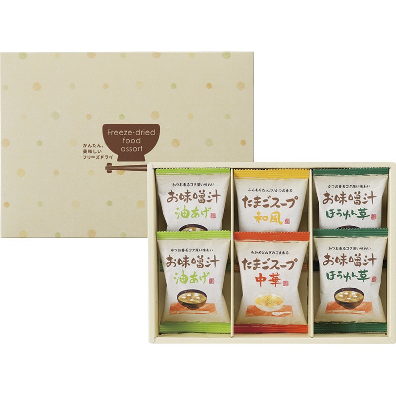 お湯を注ぐだけでおいしさそのままの 「お味噌汁ほうれん草・お味噌汁油あげ・たまごスープ和風・たまごスープ中華」4種類のお味噌汁とスープの詰合せです。
