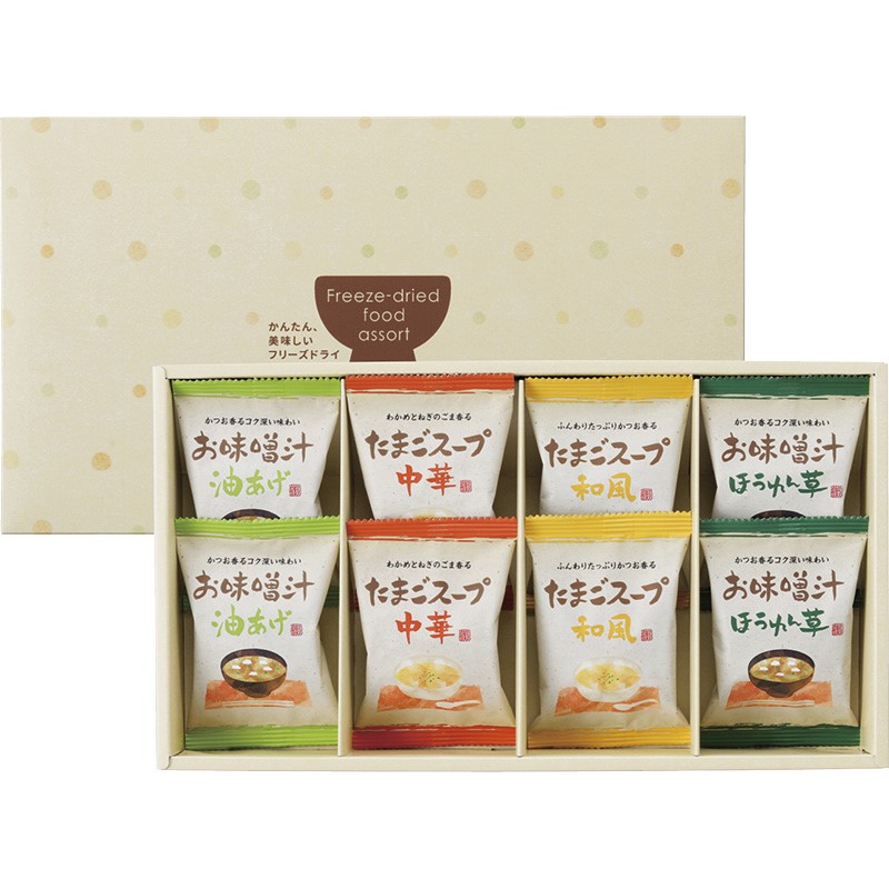 お湯を注ぐだけでおいしさそのままの 「お味噌汁ほうれん草・お味噌汁油あげ・たまごスープ和風・たまごスープ中華」4種類のお味噌汁とスープの詰合せです。