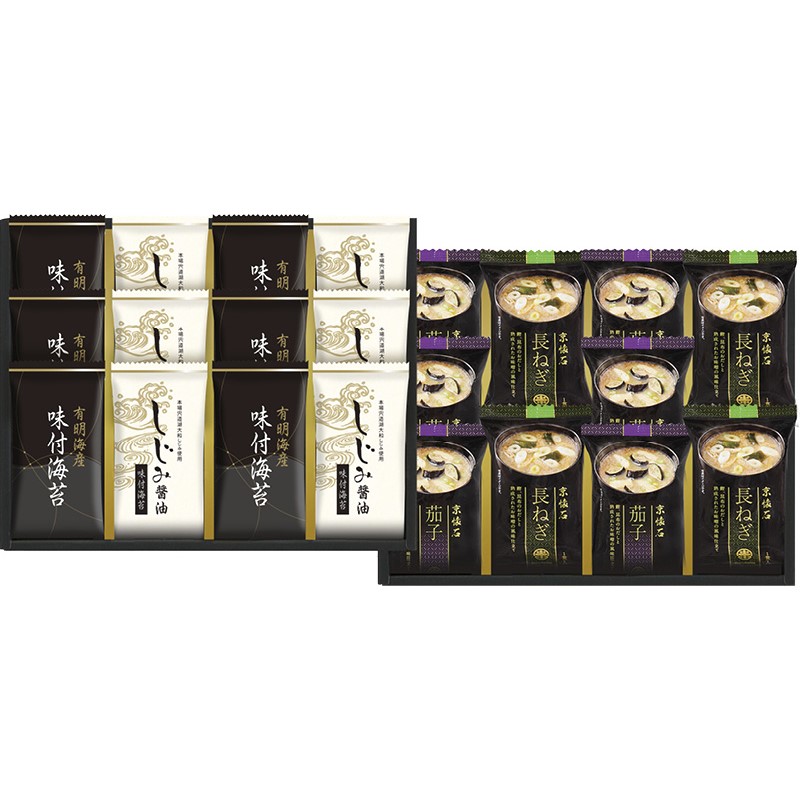 有明海産味付海苔・しじみ醤油味付海苔(各8切8枚)・マルコメ京懐石茄子のおみそ汁(11.5g)×各6、マルコメ京懐石長ねぎのおみそ汁(15.7g)×4