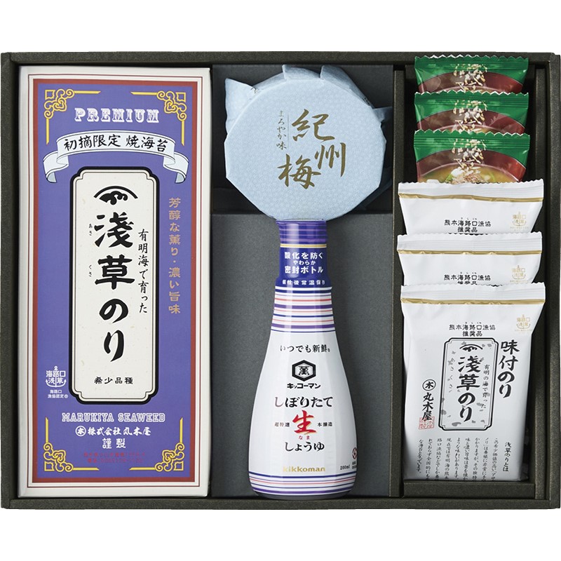 浅草味付のり(8切8枚)・マルトモフリーズドライ味噌汁ほうれん草(7.5g)×各3、浅草焼のり(半切5枚×2袋)・キッコーマンしぼりたて生しょうゆ(200ml)・紀州南高梅(100g)×各1