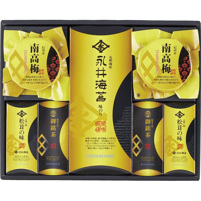 永井お吸い物(2袋)・南高梅(100g)・深蒸し茶(40g)×各2、永井味付海苔(8切6枚×3袋)×1