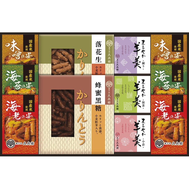 あられ(海老・海苔・味噌)(各12g)×各2、羊かん(抹茶・練り・小倉)(各60g)・かりんとう(蜂蜜黒糖・落花生)(各40g)×各1