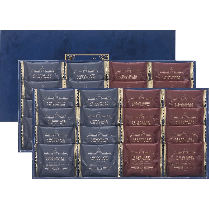 サクサク食感のワッフルクッキーにホワイトチョコクリームを詰めた風味豊かなショコラワッフルクッキーといちごチョコクリームを詰めたいちごワッフルクッキーの詰合せです。
