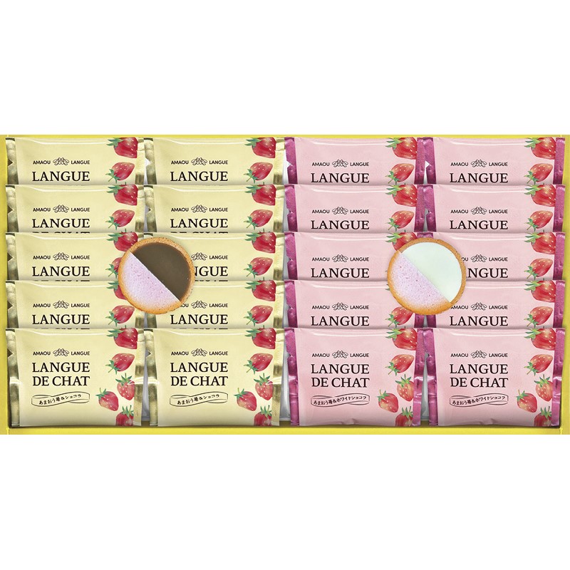 福岡県産あまおうを使用したいちごピューレを練り込んだサクサクのラングドシャクッキーでオリジナルのミルクチョコとホワイトチョコをサンドしました。優しい甘さと軽い食感、滑らかなくちどけをお楽しみください。