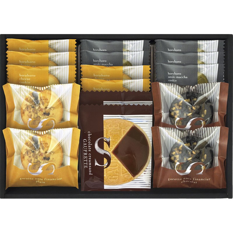 ほろほろクッキー(チーズ・抹茶)×各5、ごろっとナッツフィナンシェ(バニラ・ショコラ)・ゴーフレット(チョコ)×各2