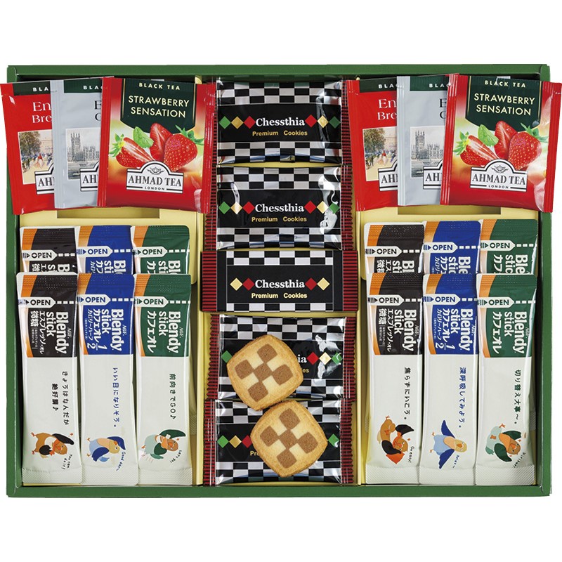 チェスティアクッキー×12、AGFブレンディスティックコーヒーカフェオレ(8.8g)・AGFブレンディスティックコーヒーエスプレッソオレ(6.2g)・AGFブレンディスティックコーヒーカフェオレカロリーハーフ(5.4g)×各4、紅茶(アールグレイ・ブレックファースト・ストロベリー)(各2g)×各2