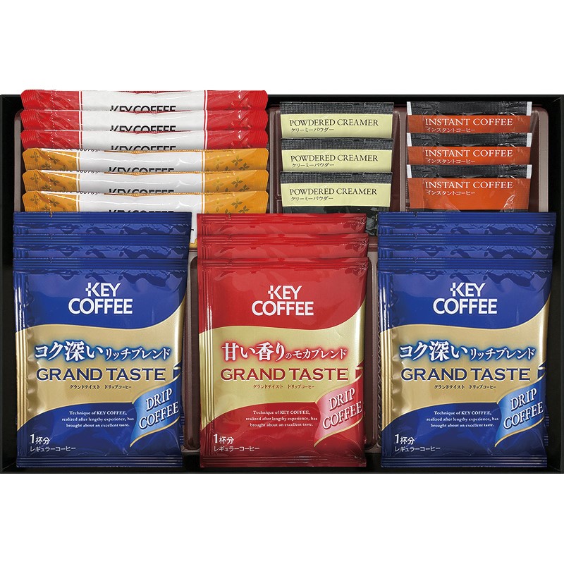 ドリップコーヒー(リッチブレンド)×6、ドリップコーヒー(モカブレンド)・スティックコーヒー(カフェモカ)(7.8g)・スティックコーヒー(カフェオレ)(7g)・クリーミーパウダー(2.5g)・インスタントコーヒー(2g)×各3