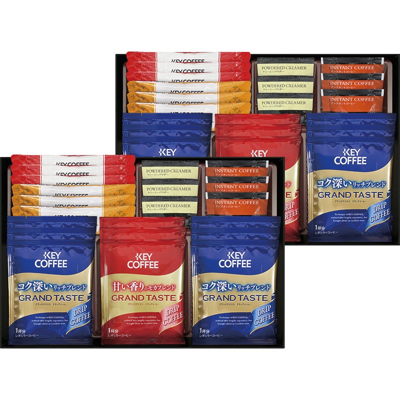 ドリップコーヒー(リッチブレンド)×12、ドリップコーヒー(モカブレンド)・スティックコーヒー(カフェモカ)(7.8g)・スティックコーヒー(カフェオレ)(7g)・クリーミーパウダー(2.5g)・インスタントコーヒー(2g)×各6