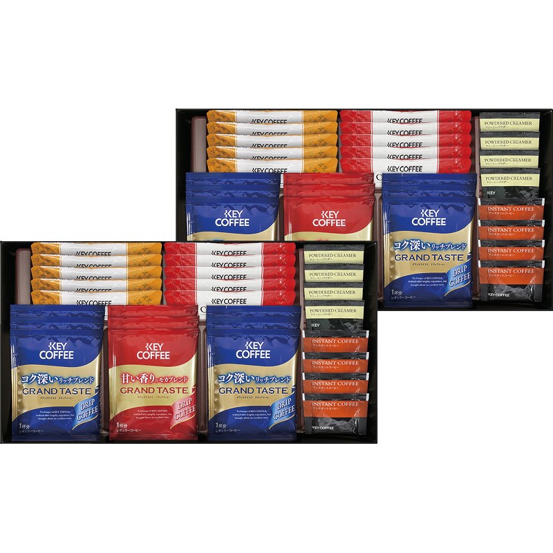 ドリップコーヒー(リッチブレンド)×12、スティックコーヒー(カフェモカ)(7.8g)・スティックコーヒー(カフェオレ)(7g)×各10、クリーミーパウダー(2.5g)・インスタントコーヒー(2g)×各8、ドリップコーヒー(モカブレンド)×6