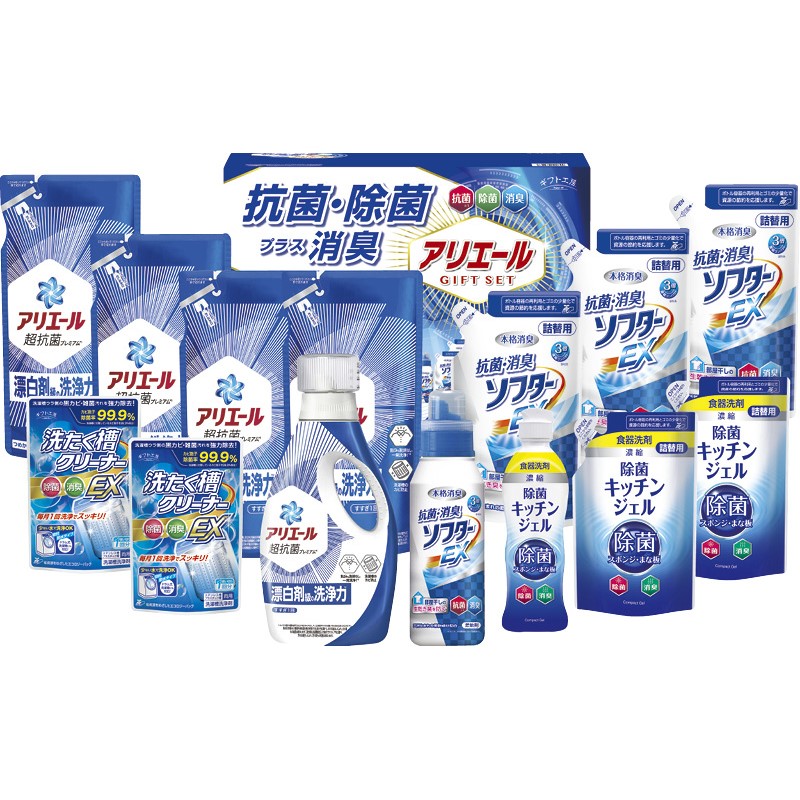 抗菌洗剤アリエールと、少量でたくさん洗える濃縮タイプの食器洗剤除菌ジェル、室内干しのイヤなニオイを防ぎ、ふっくら柔らかく仕上がる抗菌・消臭ソフターのギフトです。