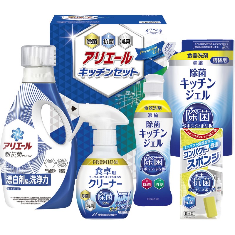 抗菌力・洗浄力に優れたアリエールにキッチンまわりの除菌・抗菌・消臭アイテムを加えたアリエールキッチンセットです。