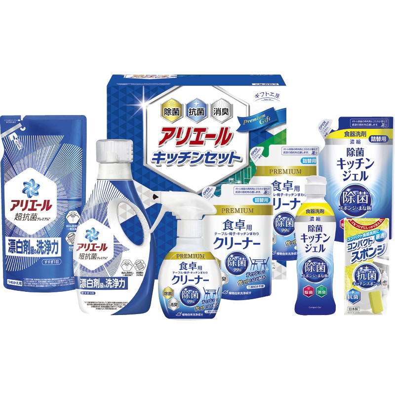 食卓用クリーナー詰替用(250ml)×2、P&Gアリエールジェル(720g)・P&Gアリエールジェル詰替用(405g)・食卓用クリーナー(260ml)・除菌キッチンジェル(200ml)・除菌キッチンジェル詰替用(160ml)・コンパクトスポンジ×各1
