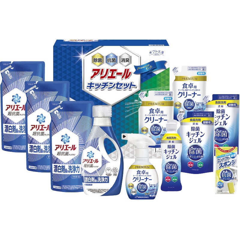 P&Gアリエールジェル詰替用(405g)×3、食卓用クリーナー詰替用(250ml)・除菌キッチンジェル詰替用(160ml)×各2、P&Gアリエールジェル(720g)・食卓用クリーナー(260ml)・除菌キッチンジェル(200ml)・コンパクトスポンジ×各1