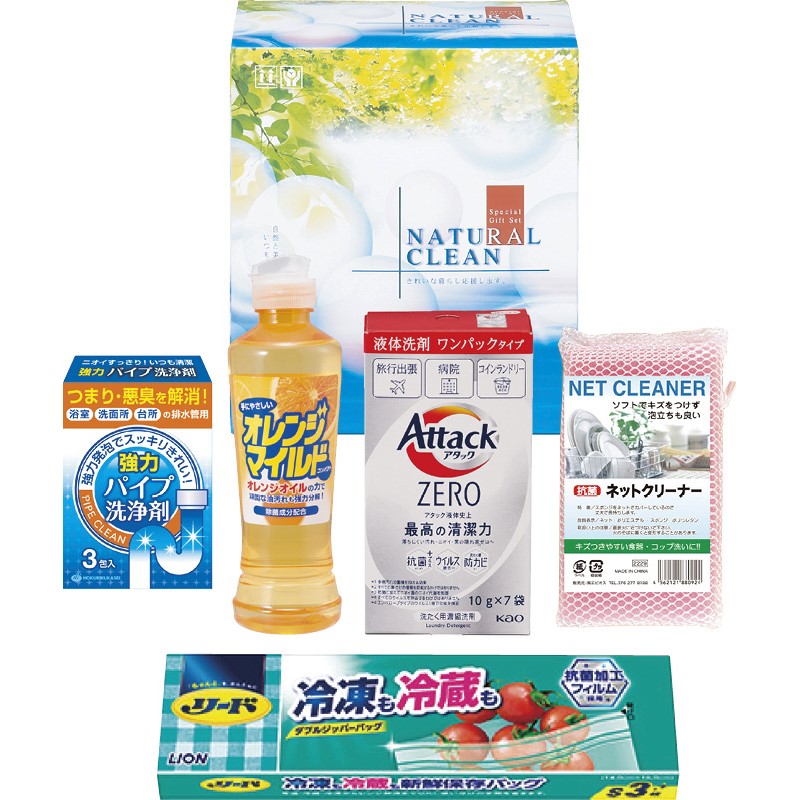 花王アタックZEROワンパック(10g×7袋)・オレンジマイルドコンパクト(270ml)・パイプ洗浄剤(3包入)・リード冷凍も冷蔵も新鮮保存バッグ(タイ)(S3枚)・ネットクリーナー(中国)×各1