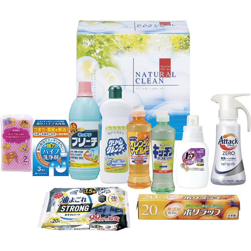 キッチンブリーチ(600ml)・クリームクレンザー・花王アタックZEROワンハンドタイプ(各400g)・ライオントップクリアリキッド抗菌(300g)・キッチンリフレッシュコンパクト・オレンジマイルドコンパクト(各270ml)・ポリラップ(22cm×20m)・クリンクル油よごれおそうじシート(20枚入)・パイプ洗浄剤(3包入)・ネットスポンジ(中国)(2個入)×各1