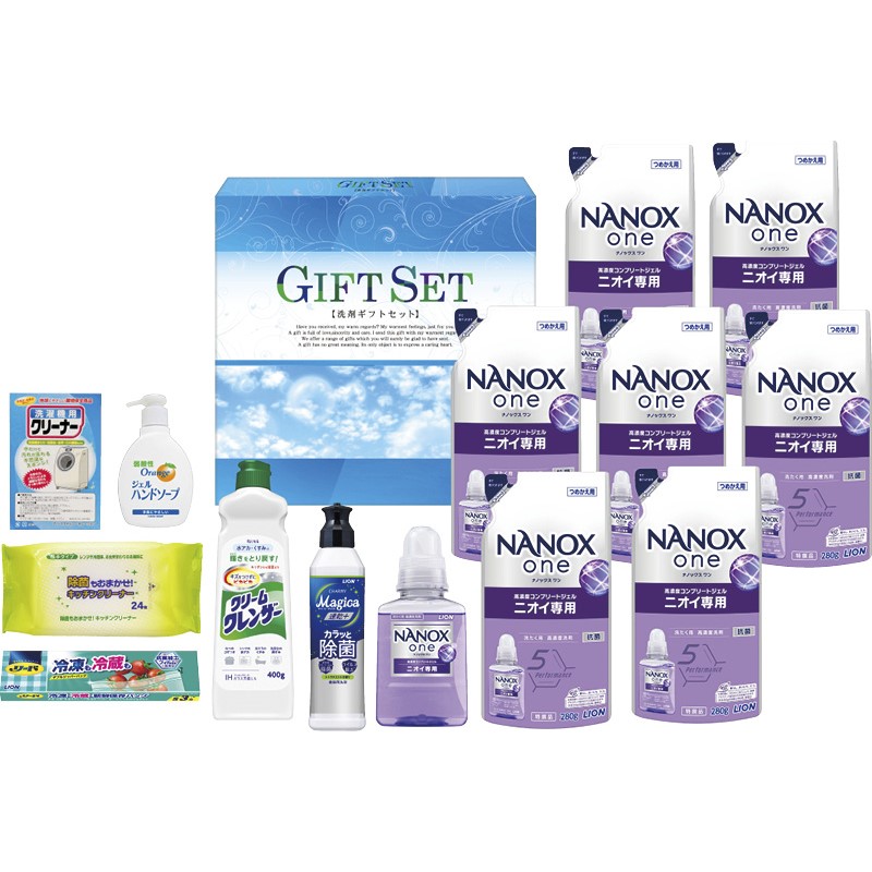 ライオンナノックスone詰替用(280g)×7、クリームクレンザー(400g)・ライオンナノックスone(380g)・ライオンチャーミーマジカ速乾+(プラス)(220ml)・オレンジジェルハンドソープ(200ml)・除菌キッチンクリーナー(24枚)・洗濯機用クリーナーM・ライオンリード冷凍も冷蔵も新鮮保存バッグ(タイ)(S3枚)×各1