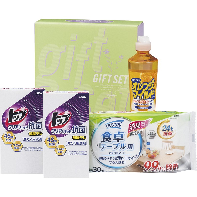ライオントップクリアリキッド抗菌(25g×2袋)×2、オレンジマイルドコンパクト(270ml)・クリンクル食卓テーブル用シート(30枚入)×各1