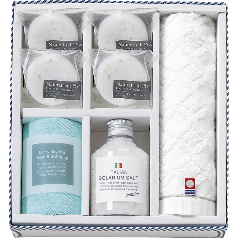 ソルトフィズ(40g)×4、イタリアンバスソルト(イタリア)(180g)・今治ウォッシュタオル(28×30cm)・マイクロファイバークロス(中国)(25×25cm)×各1