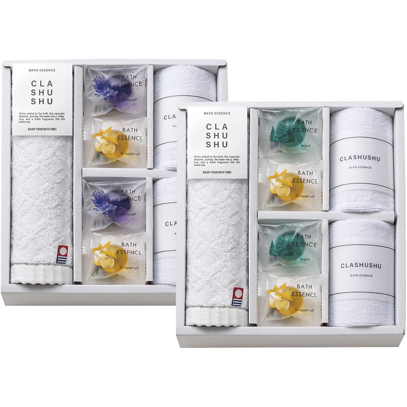 バスエッセンス(グレープフルーツ)(8g)・マイクロファイバークロス(中国)(25×25cm)×各4、バスエッセンス(ウッド・ラベンダー)(各8g)・今治ウォッシュタオル(28×30cm)×各2