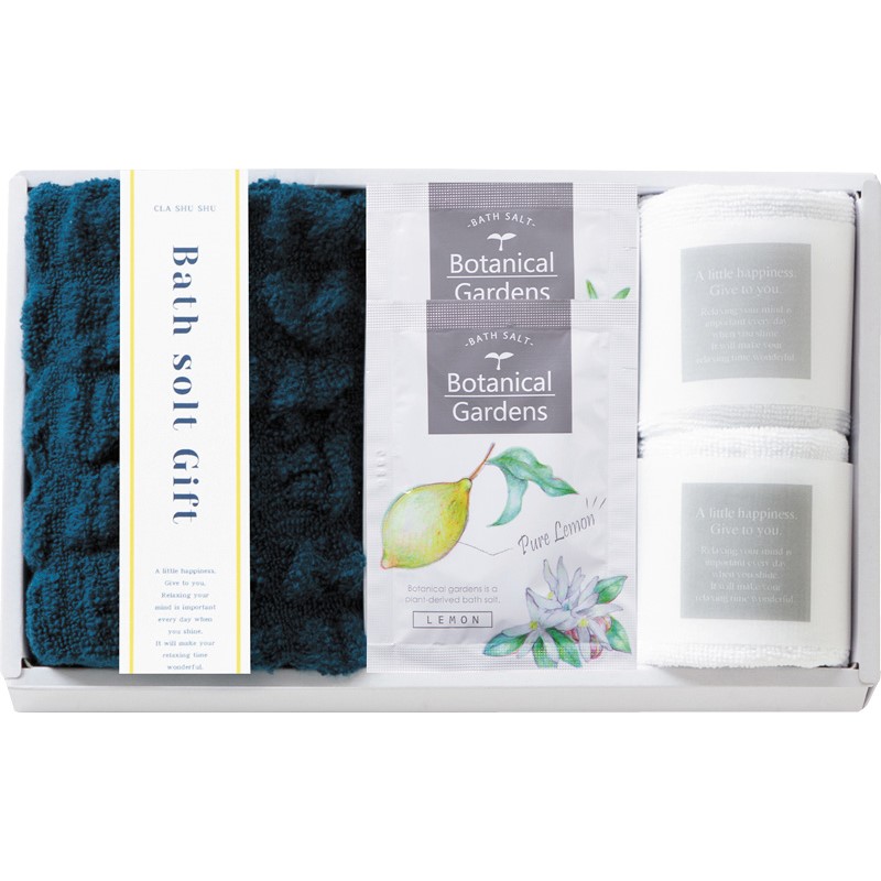 マイクロファイバークロス(中国)(25×25cm)×2、バスソルト(レモン・セージ)(各25g)・ふわもこウォッシュタオル(中国)(22×22cm)×各1