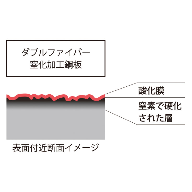両面に繊維状の凹凸を浮き立たせ、鉄の表面を窒素で硬化させる「窒化加工」を施したフライパン。より高い耐腐食性と耐摩耗性を持っています。