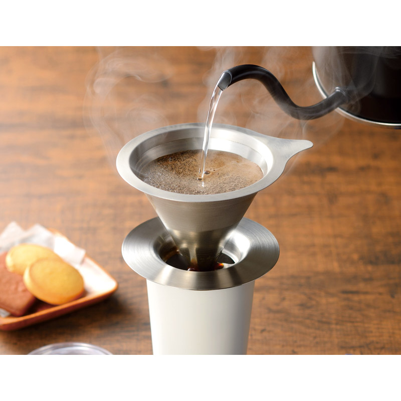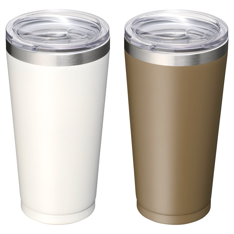 落ち着いたマットなホワイト&ブラウンのペアタンブラーです。外側は熱くなりにくく、氷を入れても結露しにくいステンレス製真空断熱二重構造なので、場所や季節を問わず使えます。