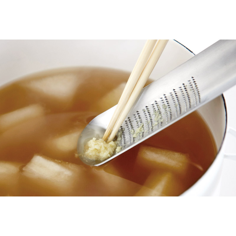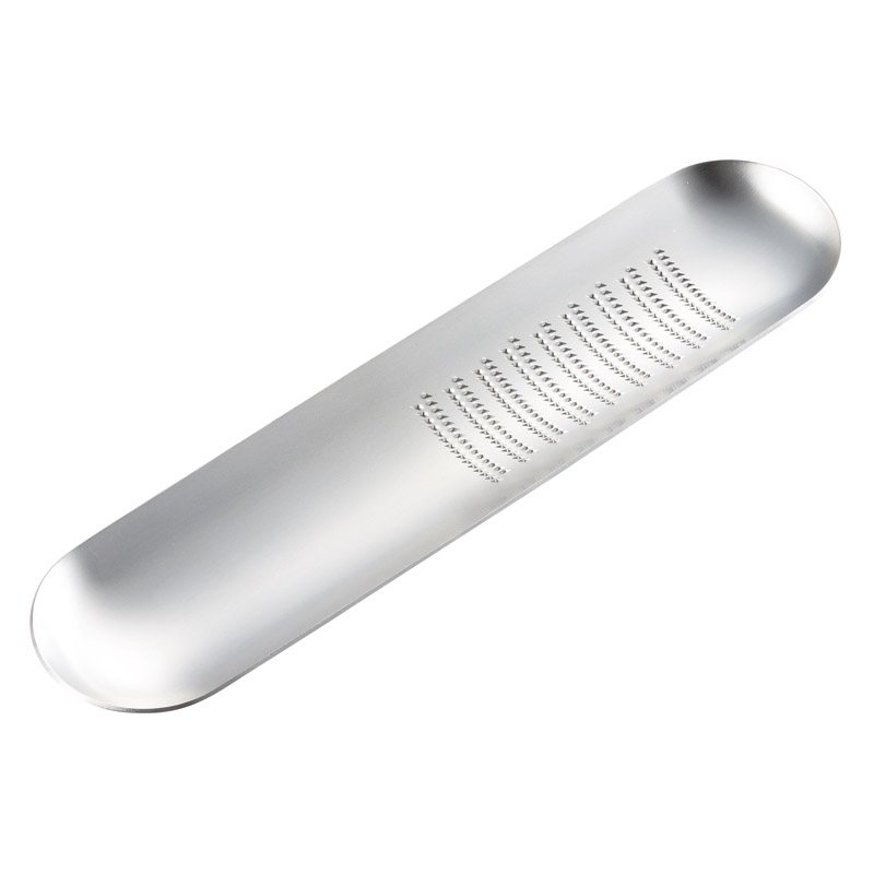 トレーのようなモダンデザインなので、そのままテーブルに出しても素敵です。ワサビやしょうがなどの薬味を卓上ですりおろし、新鮮なまま料理に添える。周囲にカーブをつけたトレー形状で、こぼれにくく、汁物などには薬味を溶かしながら入れられます。