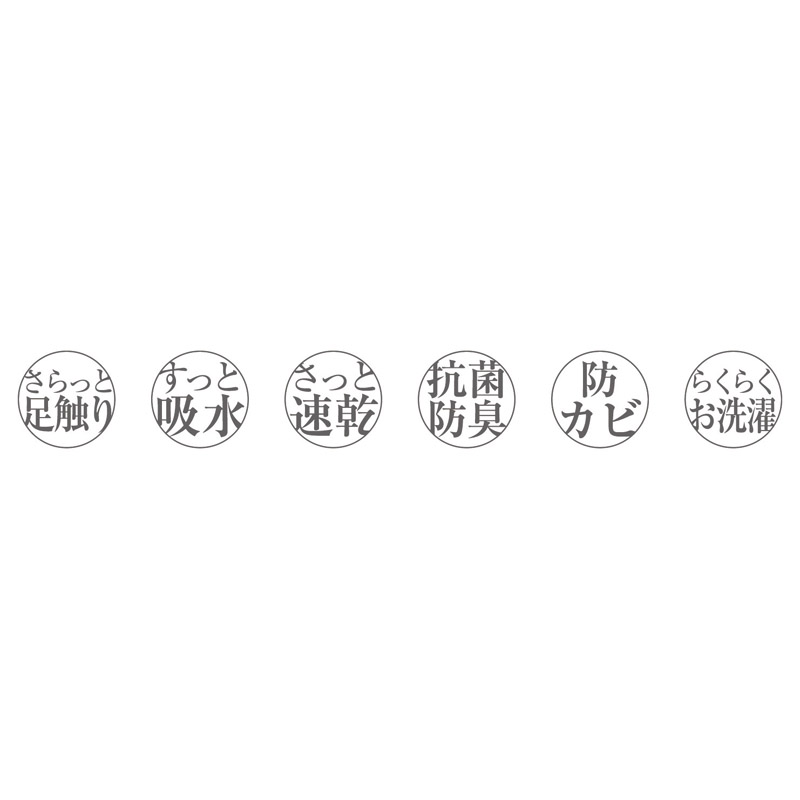 「吸水速乾」のポリエステル糸と「抗菌防臭」のアクリル糸の「2本」の糸をツイストして組み合わせたコシがあり、さらっと感が持続するバスマット。マット裏にはカビを抑制する「防カビ機能」をプラス。一見すると普通のバスマットだけど名前の通り「実はすごいバスマット」です。