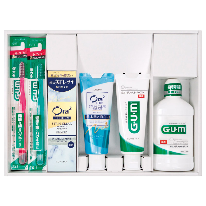 ガムデンタルペーストスタンディングタイプ(約120g)・オーラツーミーステインクリアペーストナチュラルミント(約130g)・オーラツーステインクリアペーストプレミアム(約100g)・ガムデンタルリンスレギュラータイプ(約250ml)×各1、ガムデンタルハブラシ#211ふつう×2