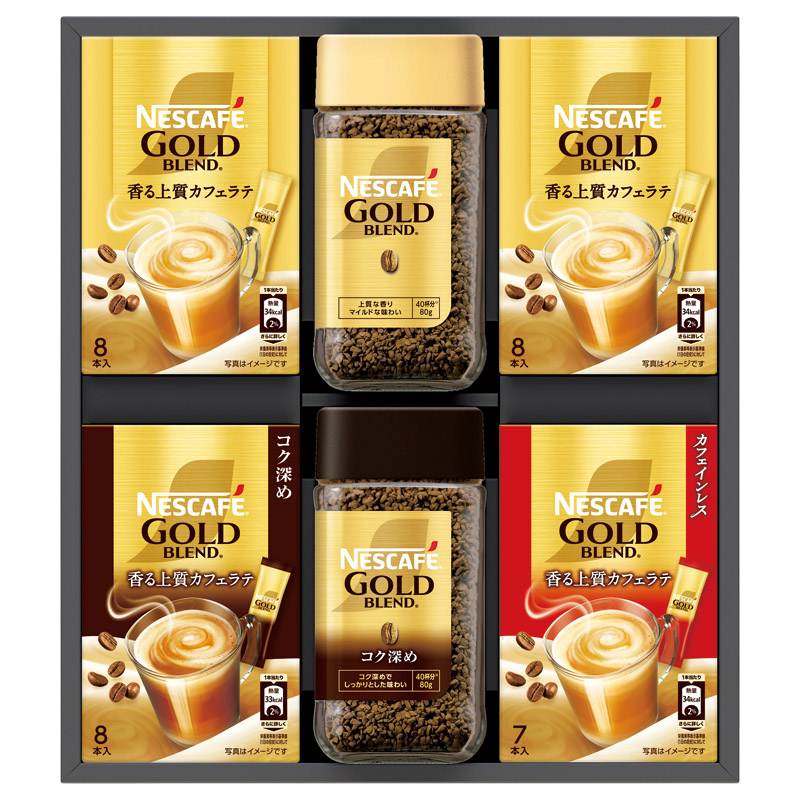 ゴールドブレンド(80g)・ゴールドブレンドコク深め(80g)×各1、ゴールドブレンドスティック(7g)×16、ゴールドブレンドコク深めスティック(7g)×8、ゴールドブレンドカフェインレススティック(7g)×7