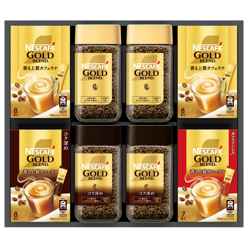 ゴールドブレンド(80g)・ゴールドブレンドコク深め(80g)×各2、ゴールドブレンドスティック(7g)×16、ゴールドブレンドコク深めスティック(7g)×8、ゴールドブレンドカフェインレススティック(7g)×7