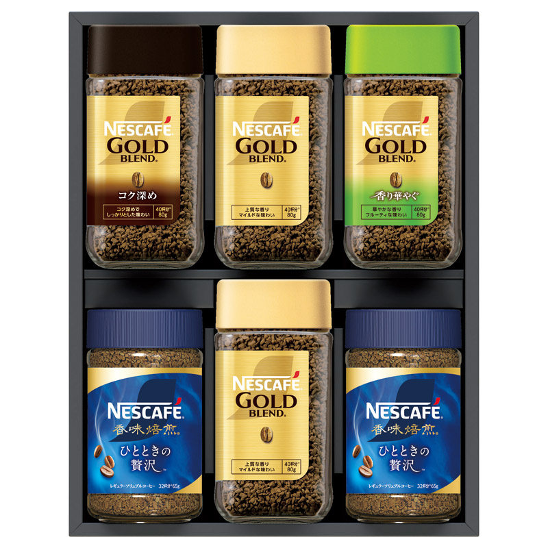 ゴールドブレンド(80g)・香味焙煎ひとときの贅沢(65g)×各2、ゴールドブレンドコク深め(80g)・ゴールドブレンド香り華やぐ(80g)×各1