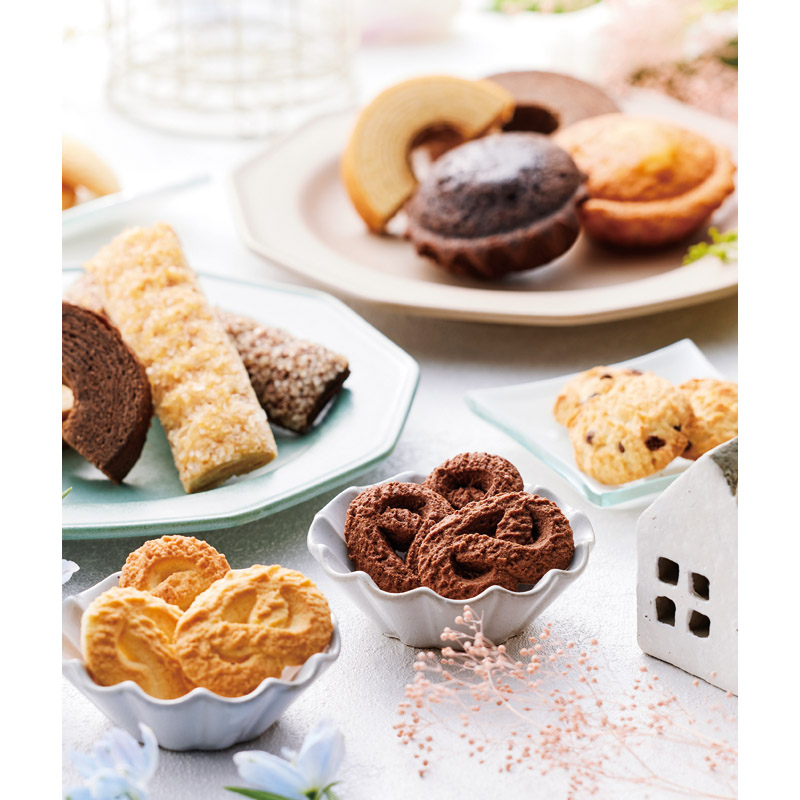 クッキー(ミルク・メープル・ショコラ・チョコチップ)×各2、スティックパイ(メープル・ショコラ)×各3、マドレーヌ(プレーン・チョコ)・バウムクーヘン(バニラ・ココア)×各1
