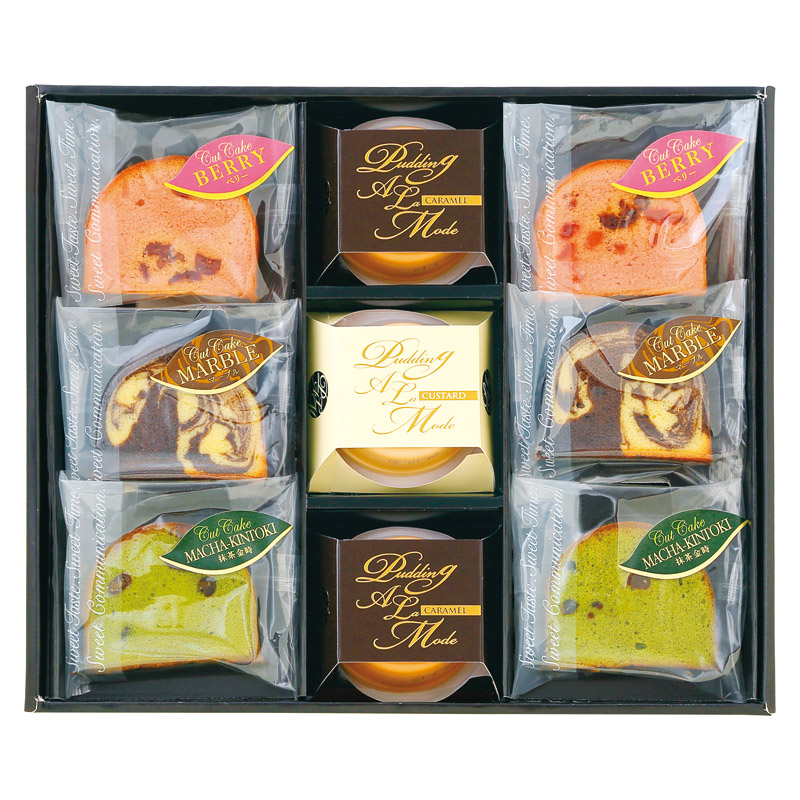 キャラメルプリン(70g)・カットケーキ(ベリー・マーブル・抹茶金時)×各2、カスタードプリン(70g)×1