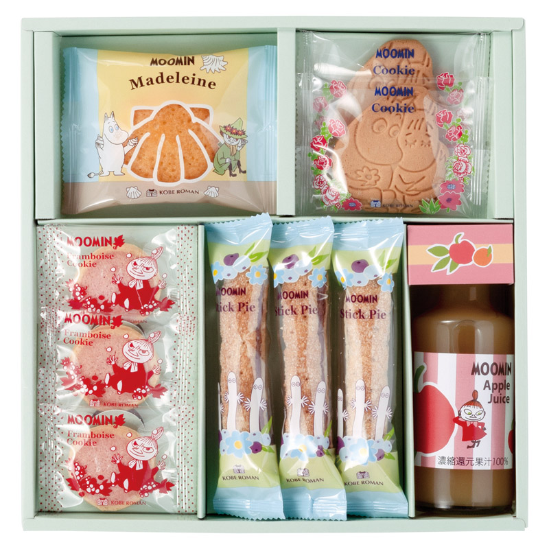 アップルジュース(180ml)・バニラマドレーヌ×各1、ブルーベリースティックパイ・フランボワーズクッキー×各3、バニラ型押しクッキー×2