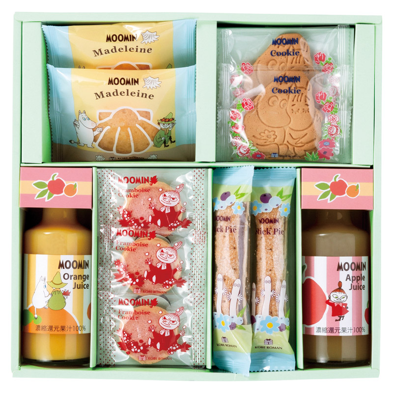 アップルジュース(180ml)・オレンジジュース(180ml)×各1、ブルーベリースティックパイ・バニラマドレーヌ・バニラ型押しクッキー×各2、フランボワーズクッキー×3